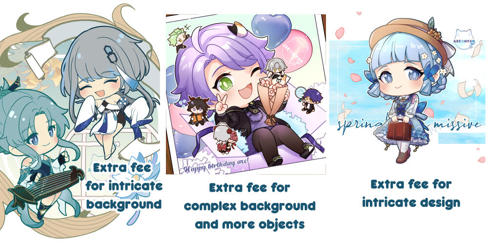 *This may vary depending on the complexity of the request. For example, a detailed full-body shaded chibi could weigh 5 slots due to the intricate design, etc.